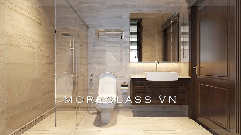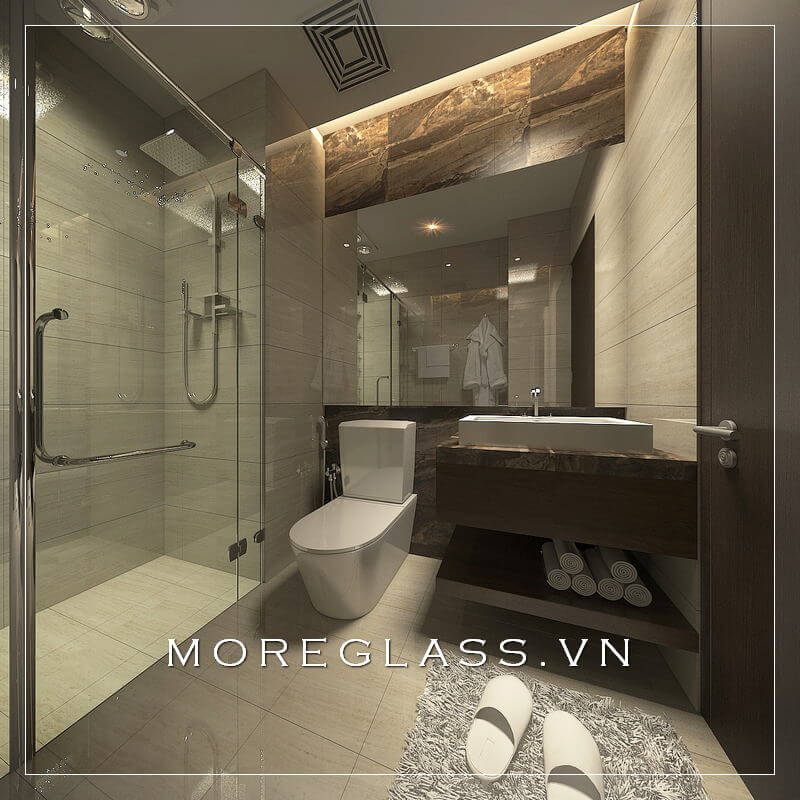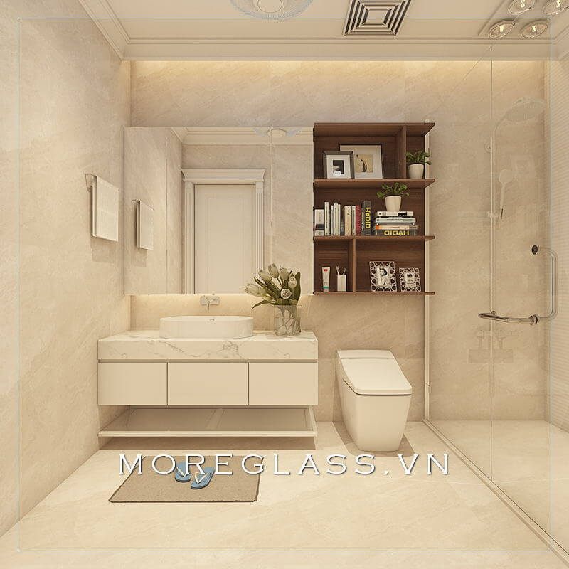 Bố trí nội thất phòng tắm nhỏ đẹp sang trọng với vách tắm kính 135 độ song song với không gian vệ sinh từ tủ, gương và bồn cầu.