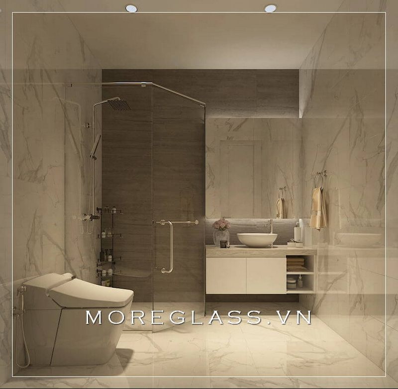 Thiết kế, thi công vách tắm kính cường lực 135 độ cho khách hàng thích không gian phòng tắm nhỏ gọn, tinh tế.
