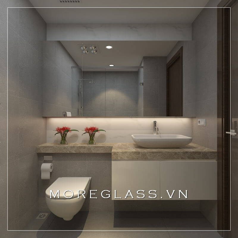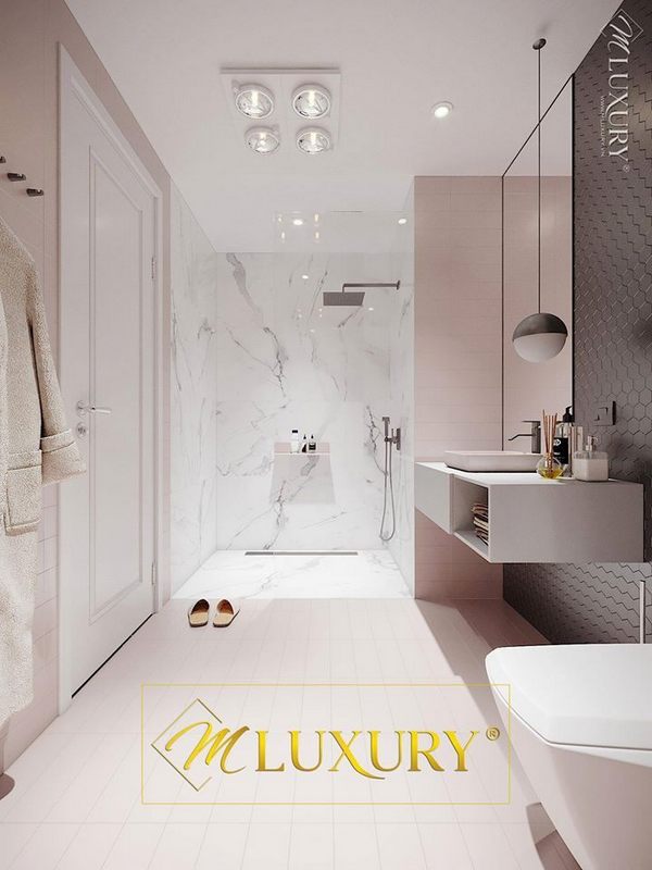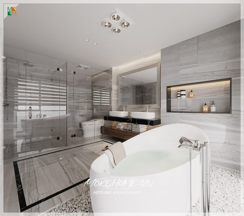 Phòng tắm được thiết kế với sự kết hợp của đá ốp màu trắng vân mây xám gây ấn tượng.