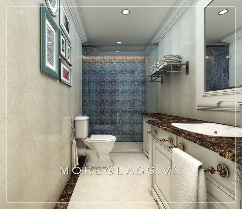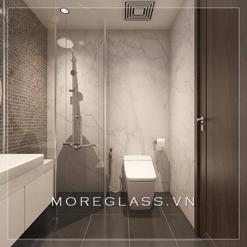 Mẫu thiết kế phòng tắm 135 độ mang đến vẻ đẹp đẽ, giúp tách rời không gian, tạo cảm giác thoải mái cho phòng.