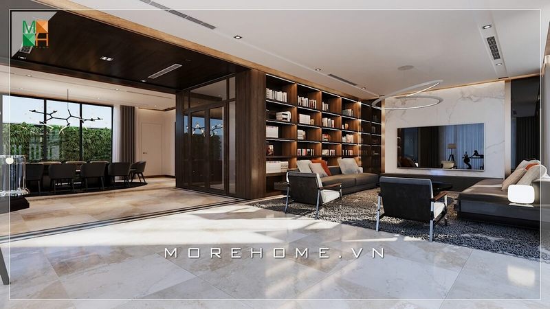 Sự thống nhất, hoàn hảo và độc đáo được tạo ra bởi việc sử dụng đá lát nền và đá ốp vách tivi trong không gian phòng khách của biệt thự, nhà phố.