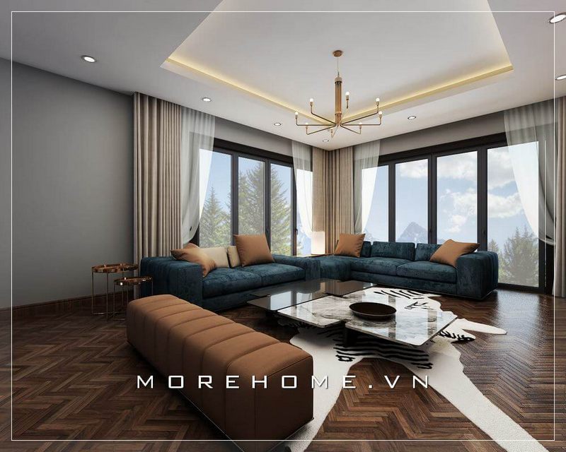 Không gian căn phòng được nâng cao bởi bộ sofa nỉ hiện đại và cao cấp có màu xanh sẫm.